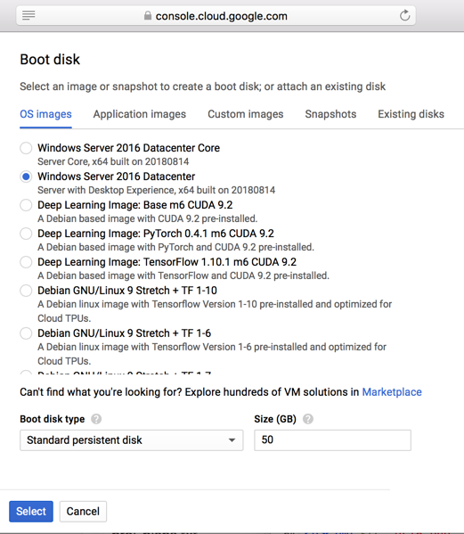 In the next screen, click "Windows Server 2016 Datacenter", as shown below, and click Select.
