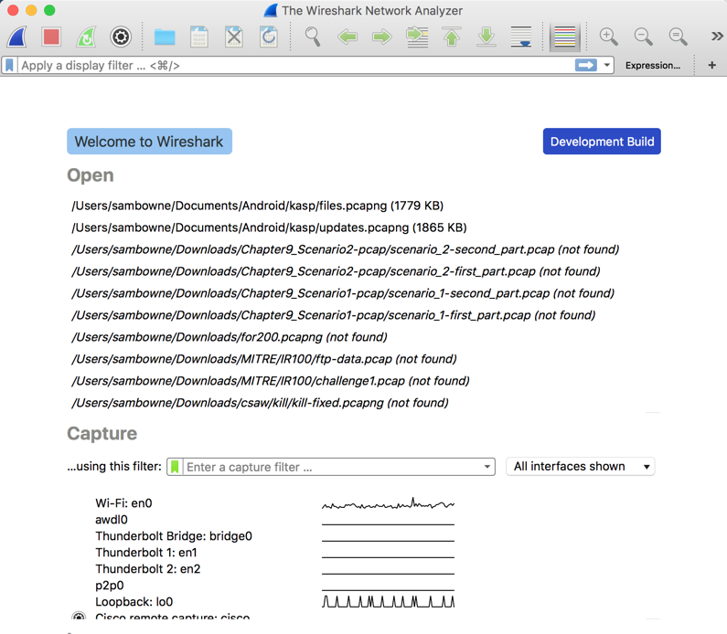 At the bottom, there's a list of interfaces. Double-click the interface that connects to the Internet, showing a wavy line indicating network traffic. When I did it, the interface was "Wi-Fi:en0", as shown below.
