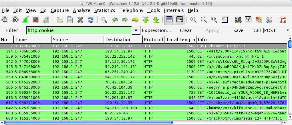 Press Enter. This shows only HTTP requests that contain cookies. Even when filtered this way, I found a lot of packets, as shown below.
