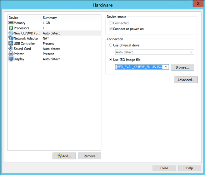 In the "Hardware" box, on the left side, click "New CD/DVD". On the right side, click the "Use ISO image file" button.