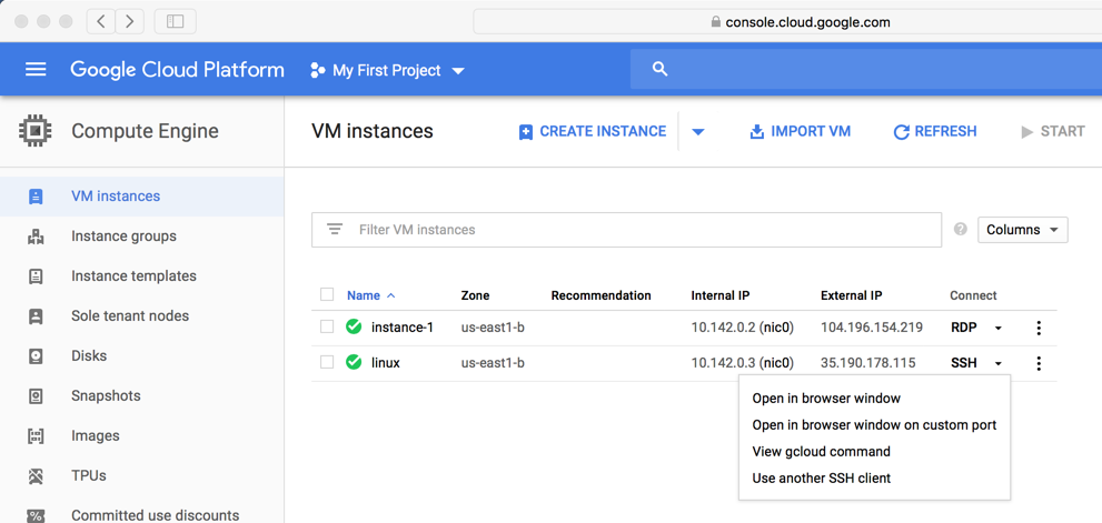In the "linux" line, in the "Connect" column, click the drop-down arrow. Click "Open in browser window", as shown below.