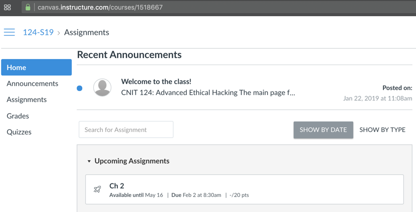 Student Learning Outcomes (measured to guide course improvements)Enumerate resources on systems using banner-grabbing and specific attacks against common Windows and Unix/Linux services including FTP, Telnet, HTTP, DNS, and many others, and protect those servicesPerform classical and modem Denial of Service (DoS) attacks, and defend networks from them Locate Web server vulnerabilities, exploit them, and cure them TextbookPenetration Testing: A Hands-On Introduction to Hacking by Georgia Weidman -- ISBN-10: 1593275641, No Starch Press; 1 edition (June 8, 2014) Buy from AmazonQuizzesThe quizzes are multiple-choice, online, and open-book. Study the textbook chapter and take the quiz before that class. Each quiz is due 30 min. before class. Each quiz has 5 questions, you have ten minutes to take it, and you can make two attempts. Live StreamingLivestream for Sat., Feb 2, 2019:https://t.co/tYvQMkJcrO |