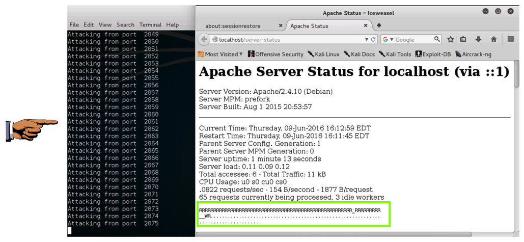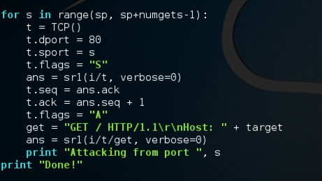 This script is very similar to the handshake.py script. The only changes are that it sends an HTTP GET each time, which is incomplete because it is missing the final carriage return and line feed, and that it loops through many source ports.