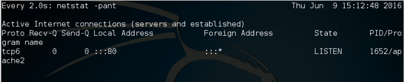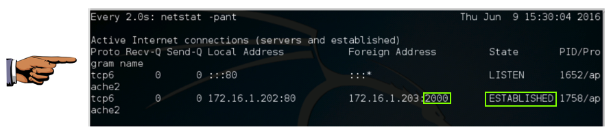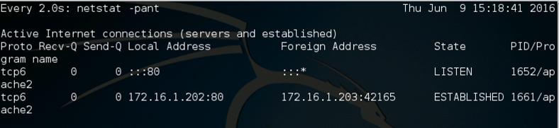On your Target Linux machine, you should see an ESTABLISHED connection to the server on local port 80, as shown below on this page. If you don't see it, try refreshing the browser on the Attacker Linux machine.