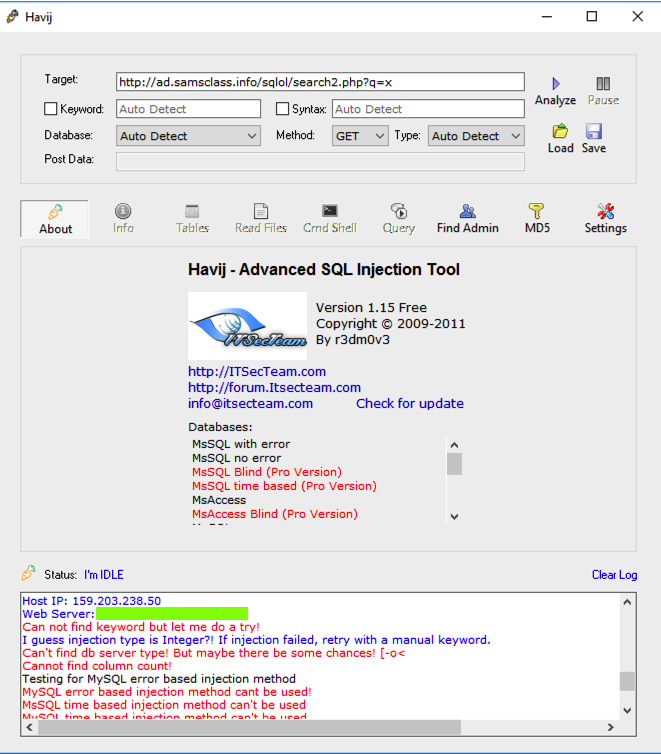 The Log at the bottom of the Havij window shows red error messages, as shown below, because the site is no longer vulnerable.