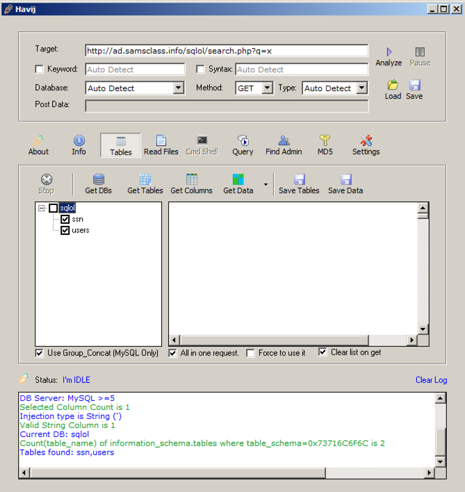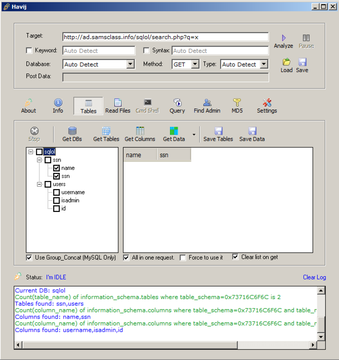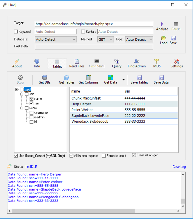 We'll steal the data with Havij, which is absurdly easy to use. In the browser, click the Back button to return to the "Find Users" page.
