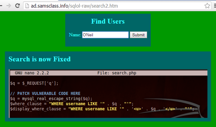 You can see how the fix works: the URL shows the original search string of O'Neil but the top of the results Web page shows the escaped version O\'Neil