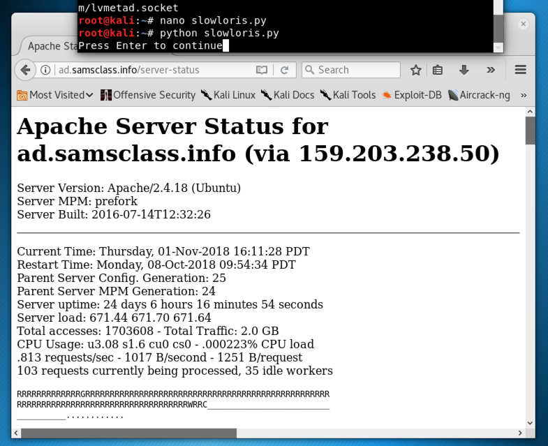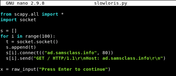 This script sends a series of 100 HTTP GETs, which are incomplete because they are missing the final carriage returns and line feeds d.