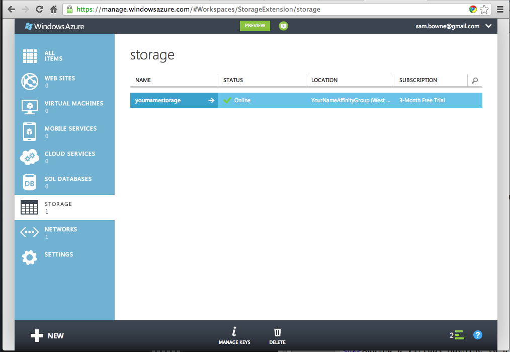 In the "STORAGE ACCOUNT" field, select yournamestorage, as shown below.