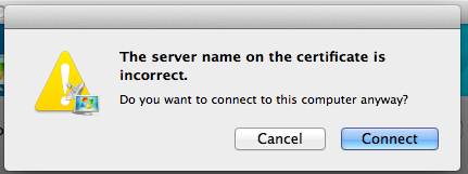 An error message appears, saying the server name on the certificate is incorrect, as shown below: