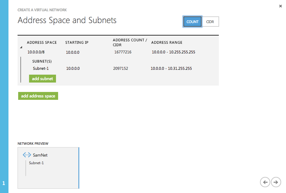 On the "Address Space and Subnets" screen, accept the default options, as shown below, and click the right-arrow icon.