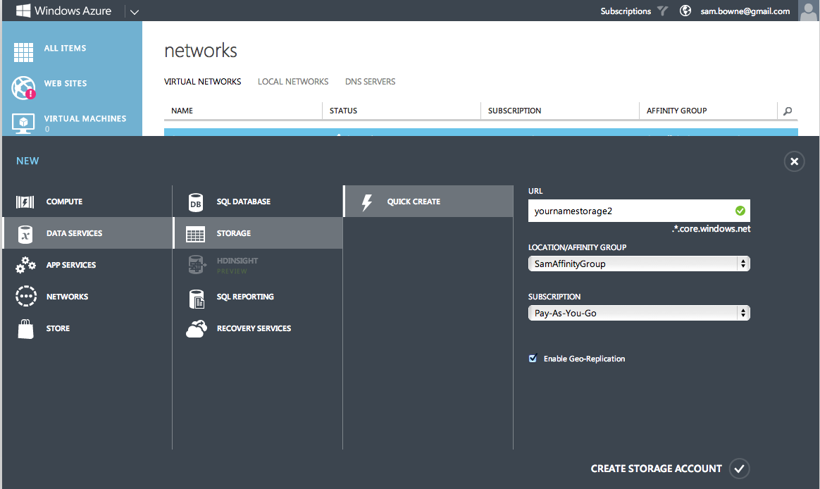 In the lower right, click "CREATE STORAGE ACCOUNT"