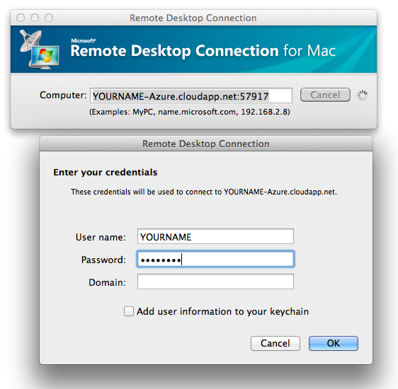 In the "Remote Desktop Connection" box, log in with the user name and password you chose earlier.
