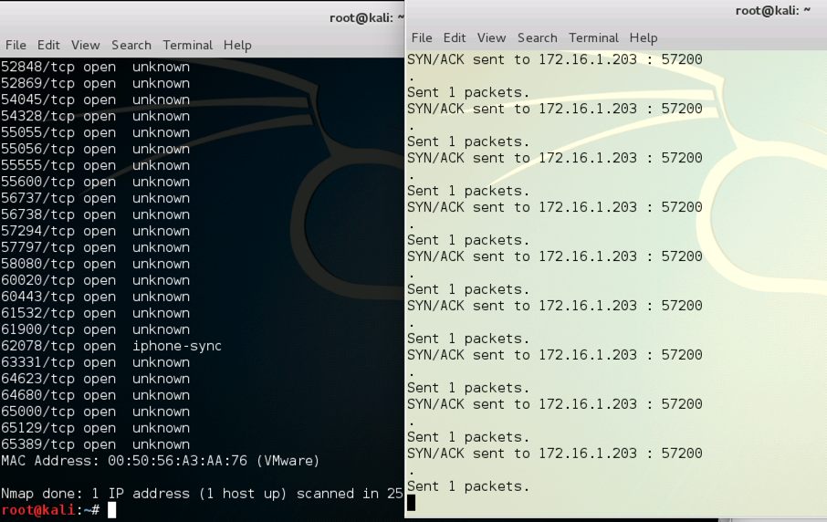 Nmap finds every port open, and yesman prints a lot of "SYN/ACK sent" messages, as shown below on this page.