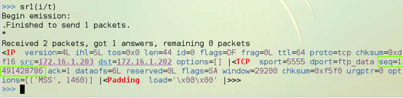 On the Sender machine, you should see a SYN/ACK reply as shown below. Note the seq value, as outlined in green below.