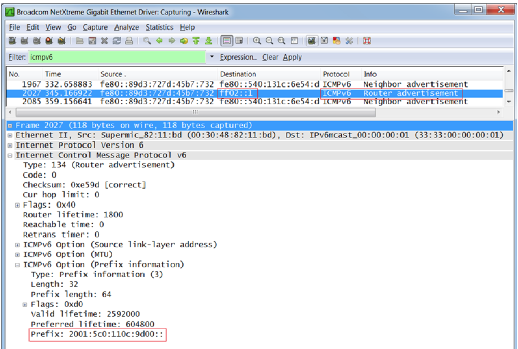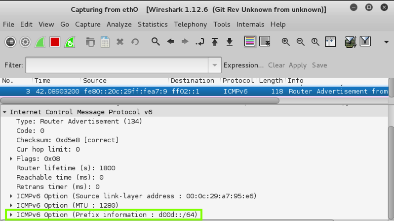 The Wireshark window should show the Router Advertisement packet. Click it in the upper pane to select it, and expand the middle pane so the Prefix: d00d:: information is visible, as shown below on this page: