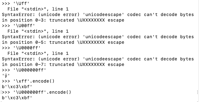 So the character '\xff' in the string is interpreted a Unicode Code Point, and it's stored in two bytes, as shown below: