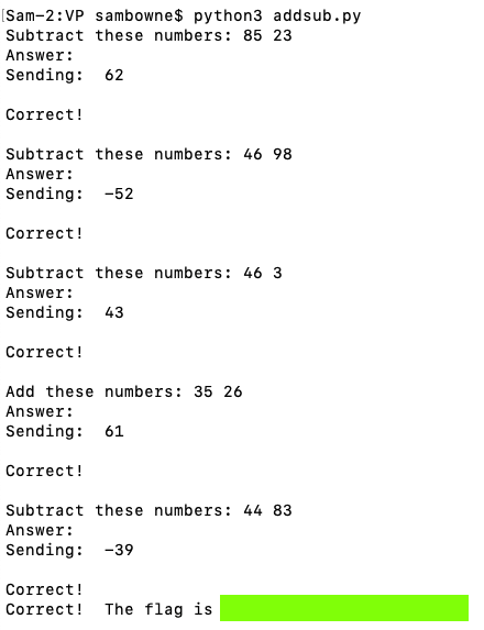Hint: Only connect once. If you connect five times, you'll always be solving the first challenge, and never see the flag.