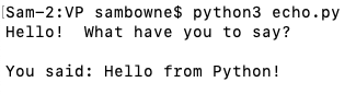 Run the program, as shown below. It sends the string "Hello from Python!" to the server, which echoes it back.