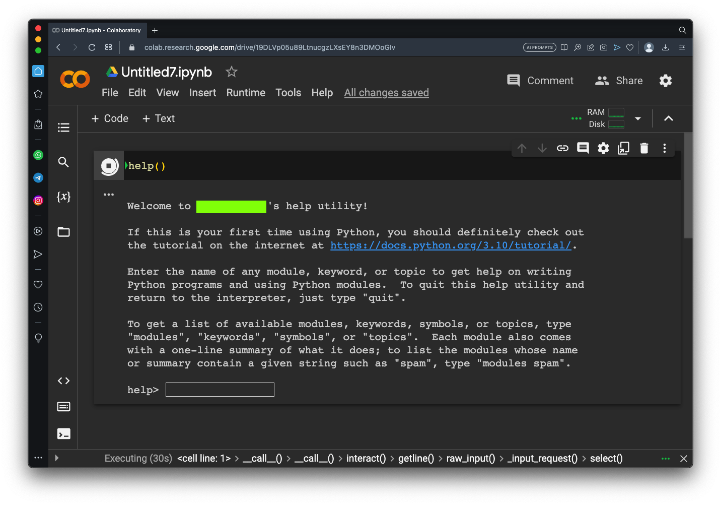 Click the Run button to stop help().