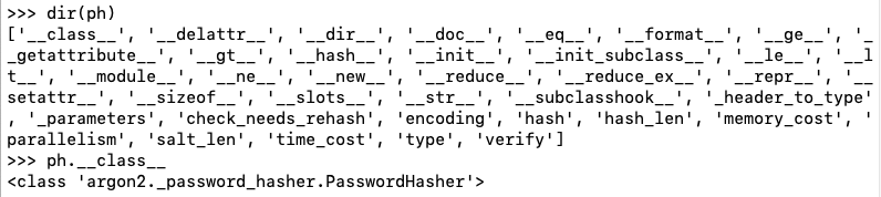 Execute these commands to see the attributes of the password hash object you created in the previous steps, and display the value of the __class__ attribute: