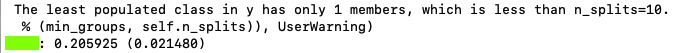 Find the worst model. There are warnings that "The least populated class in y has only 1 members", as shown below, but just ignore them.