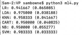 print('%s: %f (%f)' % (name, cv_results.mean(), cv_results.std()))