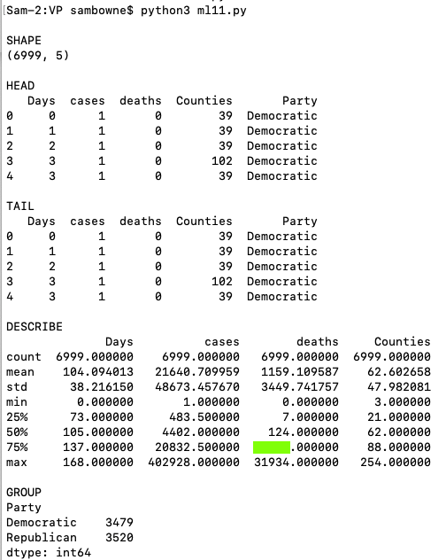Download this file:COVID19c.csv(I made it from the sources listed at the bottom of this page. It is not perfect: I only identified 50 state governors, but there were 56 states in the raw case data. Please just regard it as random numbers for this project, not scientific evidence of anything.)Load the data and print summaries, as shown below.