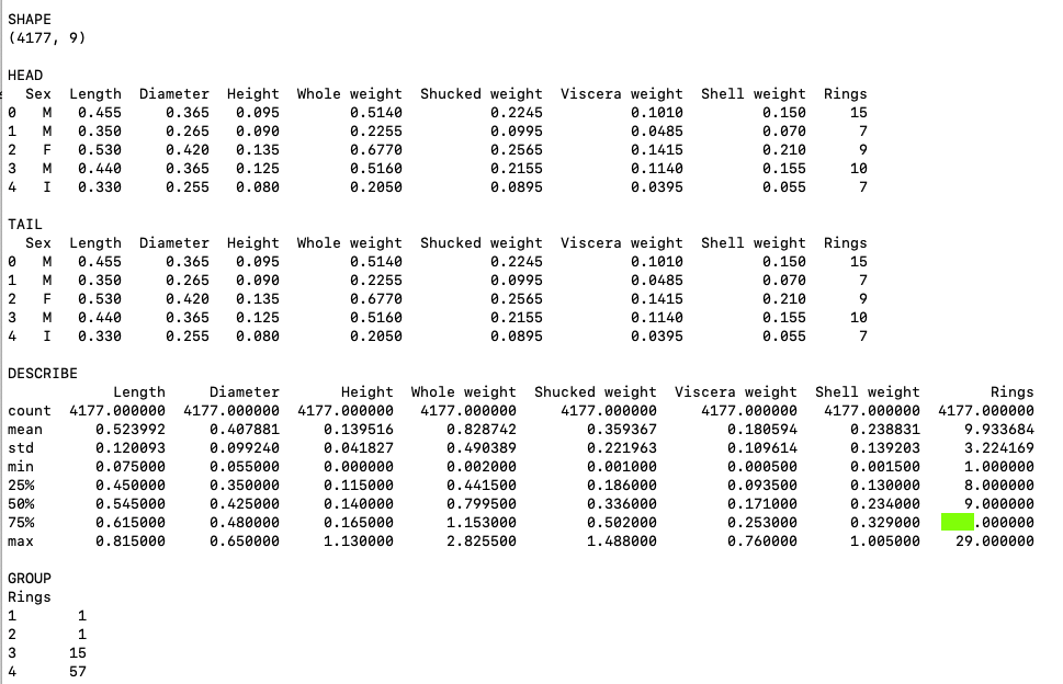 Download this file:Abalone.csv(I got it here.)Load the data and print summaries, as shown below.