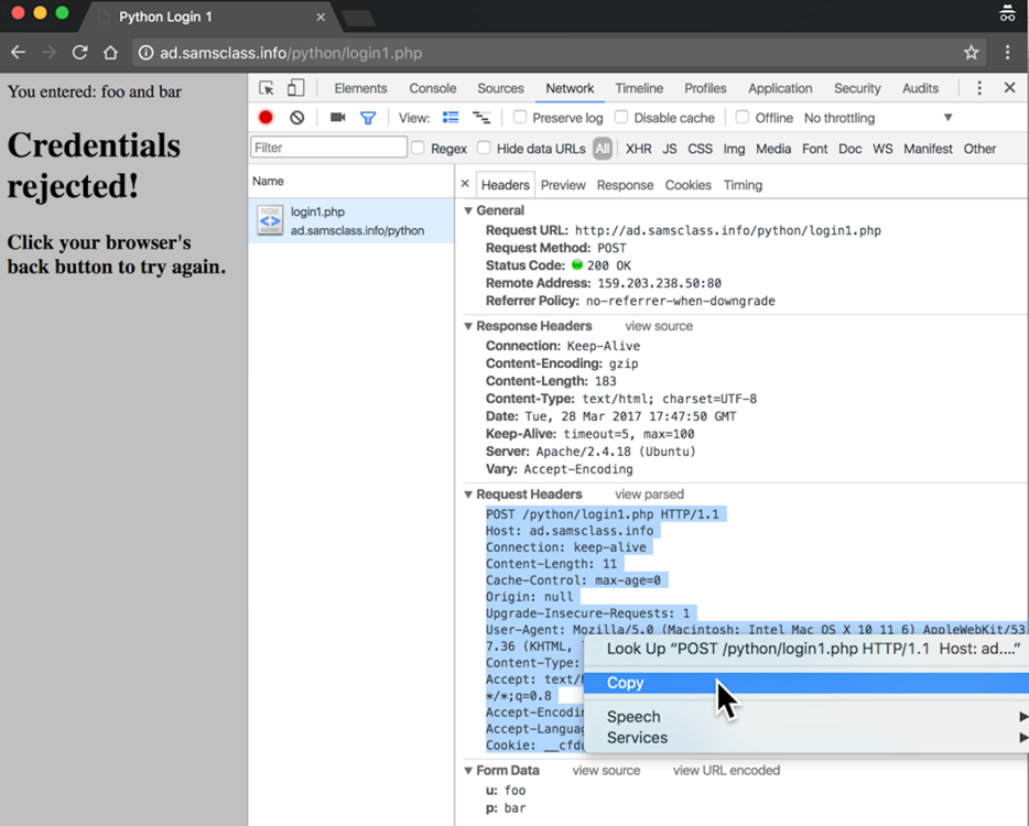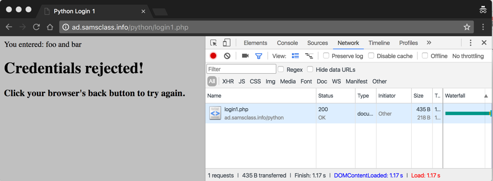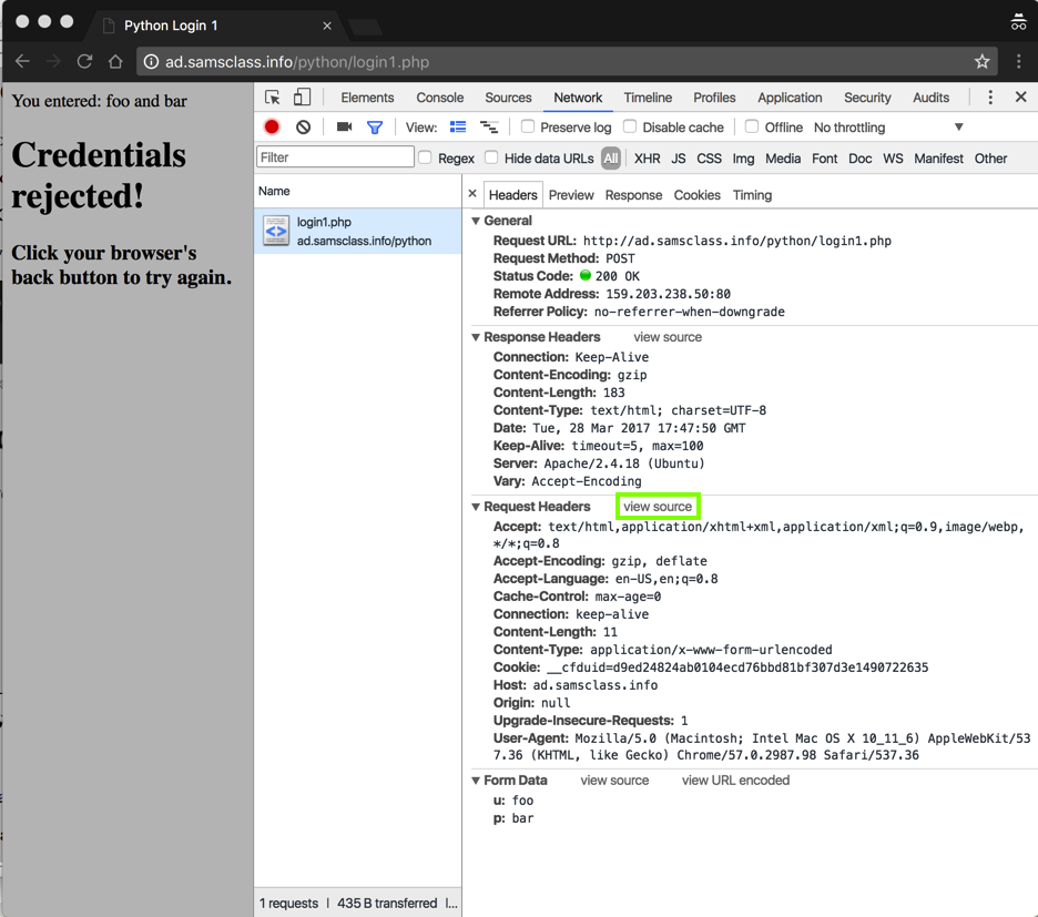 In the "Developer Tools" pane, click login1.php. Details of the network request appear.