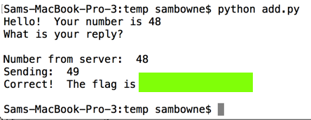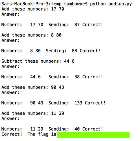 Combine two numbers as required and send the result. You have to get all five answers correct within five seconds to get the flag, covered by a green box in the image below.