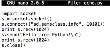 import socket import the "socket" library, which contains networking functions s = socket.socket() create a socket object named "s" s.connect(("ad.samsclass.info", 10101)) connect to the server "ad.samsclass.info" on port 10101 s.recv(1024) receive data from the server, up to a maximum of 1024 characters s.send("Hello from Python!\n") send data to the server s.close() close the connection and destroy the "s" object