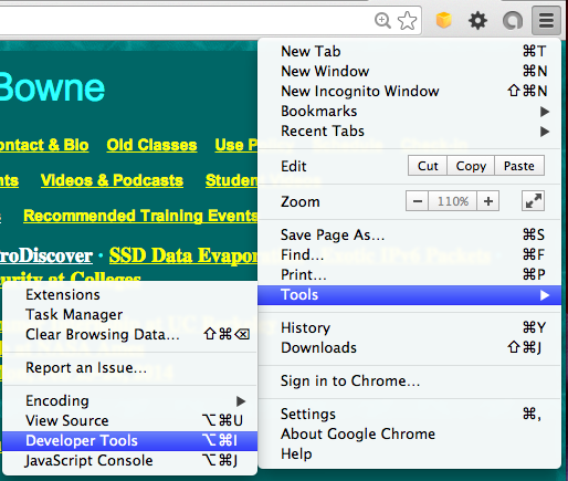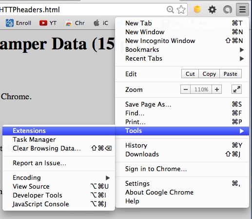 In the Chrome window on the upper right, click the button with three horizontal lines, and then click Tools, "Developer Tools".In Chrome, go to http://samsclass.info/header.php