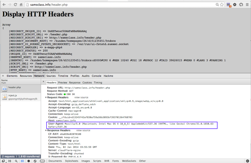 In the upper section of the Chrome window, scroll down to show the "HTTP_USER_AGENT" line. The "User Agent" received by the server is shown above, and the User-Agent sent by your browser is shown below, in the Developer Tools section. The two values match, as shown below: