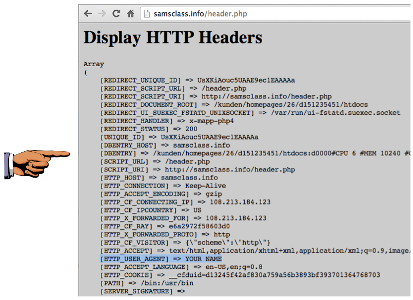 Make sure you can see YOUR NAME on the HTTP_USER_AGENT line.
