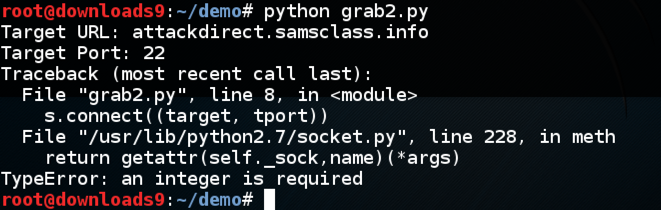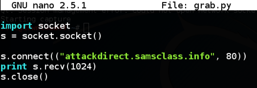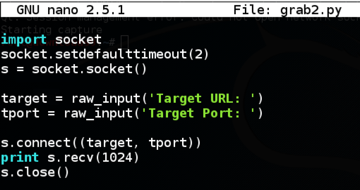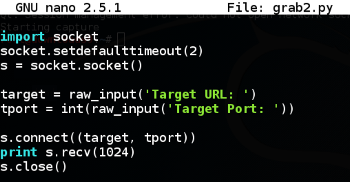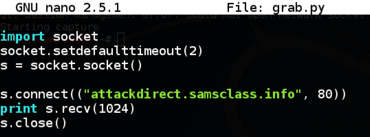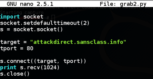 Run the script again. There is no banner from an HTTP server, so it just freezes up, waiting for a banner. To stop the script, press Ctrl+C.