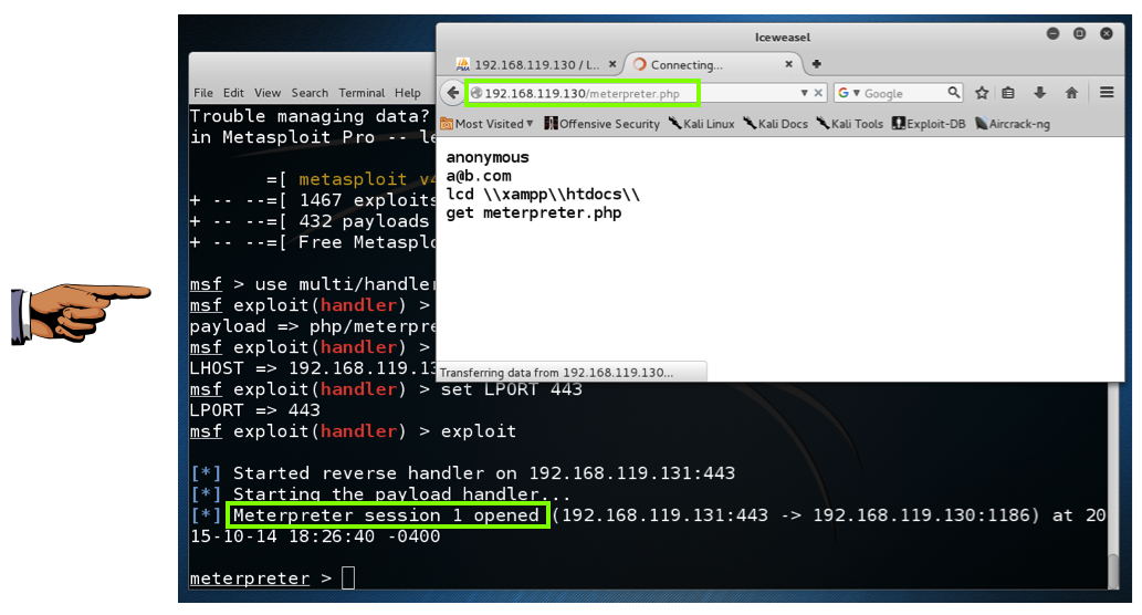 On Kali, in Firefox, go to this URL, replacing the IP address with the IP address of your Windows machine:put /tmp/shell.php