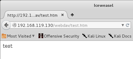 To see your file, on Kali, from the menu bar, click Applications, Favorites, Firefox, and enter this URL, replacing the IP address with the IP address of your Windows 2008 Server target.