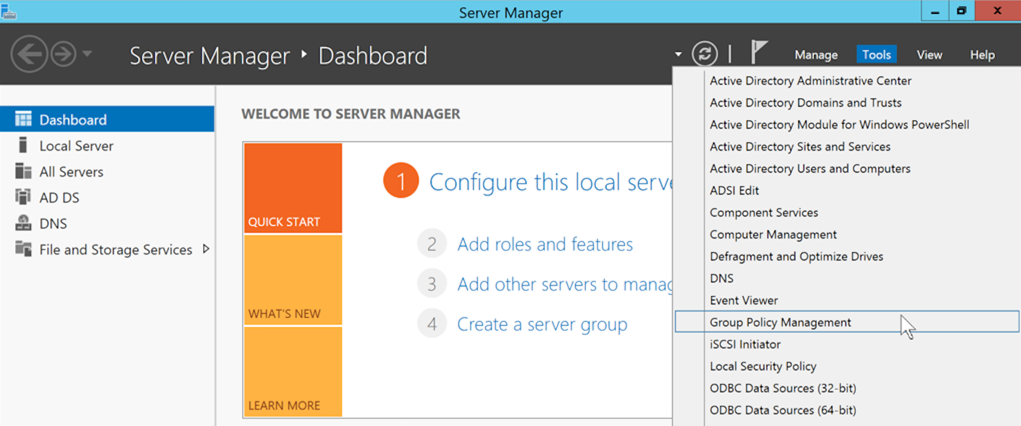 On your Domain Controller, in Server Manager, at the top right, click Tools, "Administrative Tools", "Group Policy Management", as shown below.