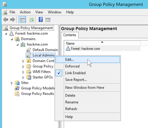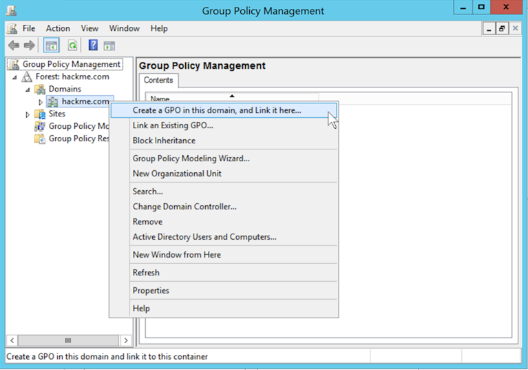 Right-click hackme.com and click "Create a GPO in this domain, and Link it here...", as shown below.
