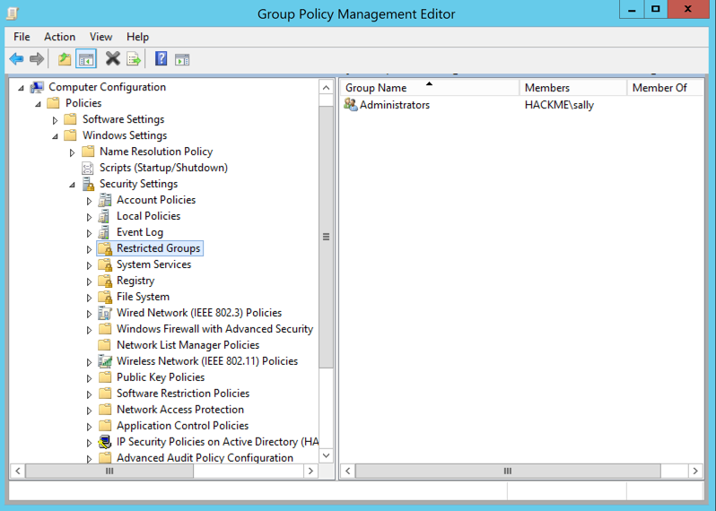 Now the right side of Group Policy Management Editor shows that sally is in the Administrators group, as shown below.