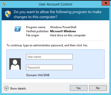 A User Account Control box pops up, asking for a user name and a password, as shown below.