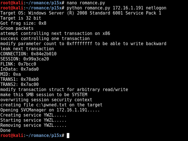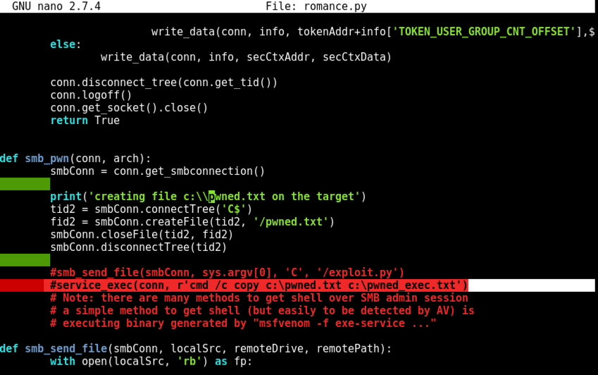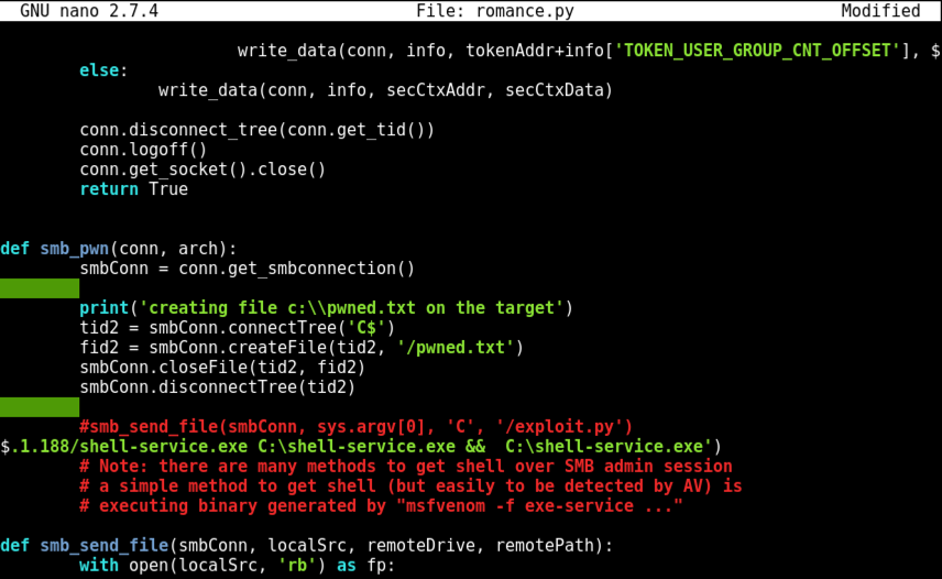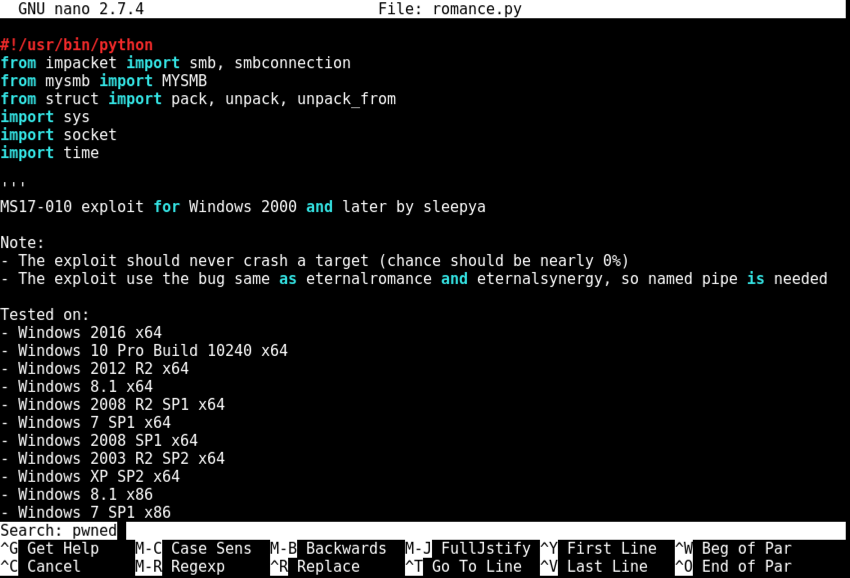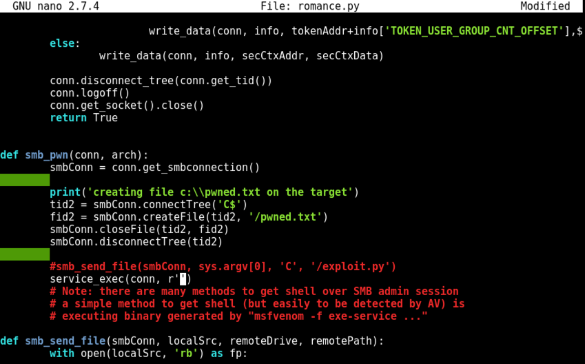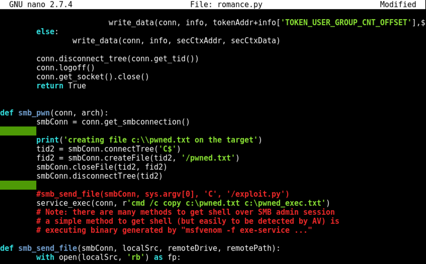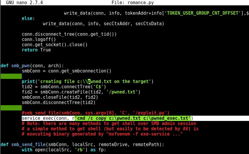 On Kali, in a Terminal window, execute these commands to copy the exploit to a file named romance.py, and edit it with nano.