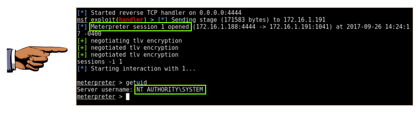 Execute these commands to interact with the shell and see who you are: you are SYSTEM, as shown below.